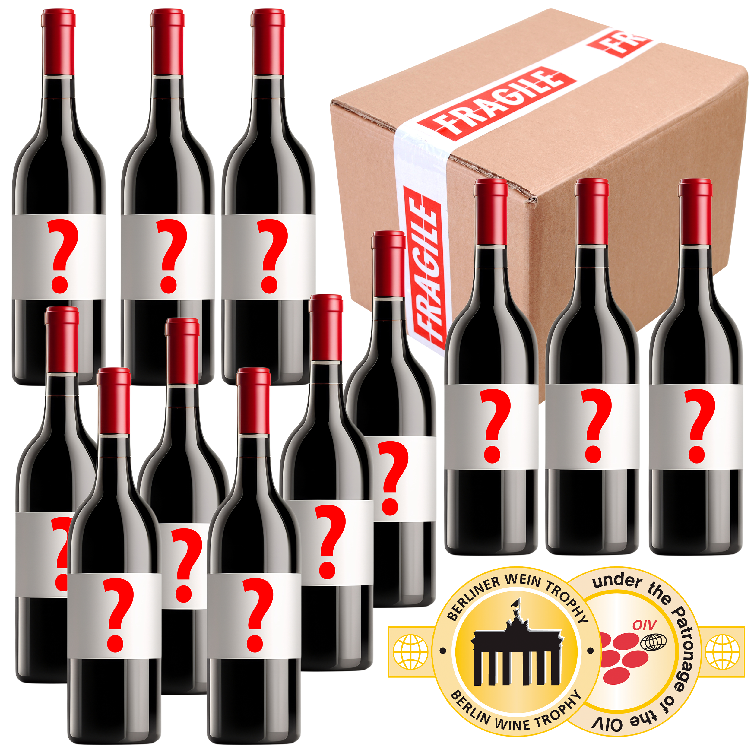 Die Überraschungskiste „Rot“ enthält 12 Flaschen unterschiedlichster Rotweine aus den verschiedenen Teilnehmerländern. Da es sich um Weine der internationalen Wettbewerbe Berliner Wine Trophy, Asia Wine Trophy, Portugal Wine Trophy aus den letzten Jahren handelt, kann die DWM keine Garantie für die Qualität und Güte dieser Weine übernehmen. Die DWM garantiert, dass der Gesamtverkaufswert der Weine über dem liegt, der für die Überraschungskiste ausgewiesen wurde. Der Preis errechnet sich nach den von den einzelnen Teilnehmern bei der Anmeldung angegebenen Verkaufspreise. In Ausnahmefällen können sich auch alkoholreduzierte und alkoholfreie Weine in den Kisten befinden.